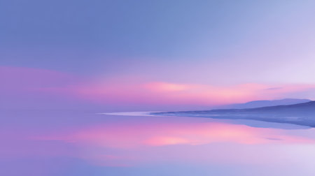 A serene scene features calm water reflecting a colorful sky. The composition showcases soft pastel hues of pink, blue, and purple in the clouds and water. The lighting suggests a sunset or sunrise, creating a peaceful and contemplative atmosphere. Suitable for use in various commercial and editorial contexts.