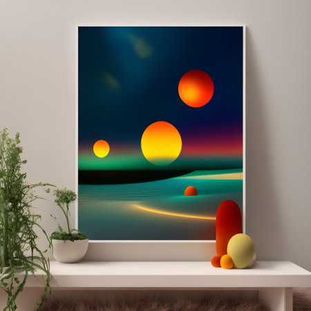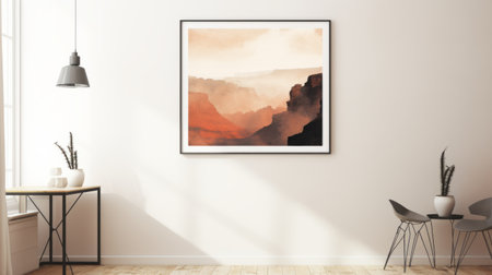 a framed cliffside painting hangs in a blue and white room, showcasing a captivating blend of light orange and light maroon hues. this digital gradient masterpiece captures the essence of expansive landscapes, reminiscent of national geographic photos. the artist, sparth, skillfully employs subtle use of light and shadow against a smokey background, creating a mesmerizing visual experience. ai generated