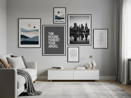 Room featuring several large paintings hung above a modern and comfortable sofa. Interior design, home decor. Generative AI Technology.