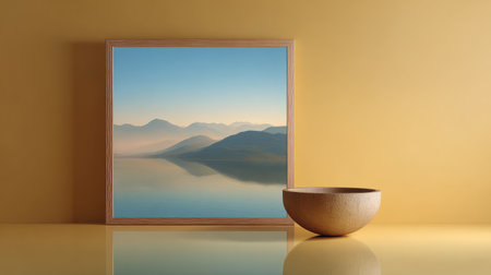 A minimalist wooden frame displays a serene mountain landscape at sunset. The scene features a range of mountains with a gradient of colors from deep blue at the base to light orange at the horizon. The frame is placed on a white surface next to two lemons, one of which is cut in half, revealing its juicy interior. The background is a simple white wall, providing a clean and uncluttered setting.