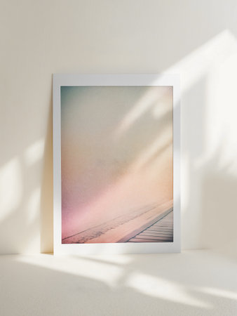 Framed Pastel Beach Scene Photograph with Sunlight Shadows: Minimalist Interior Art Display
