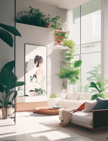 Interior of modern living room with bookshelf, plants and photo frames