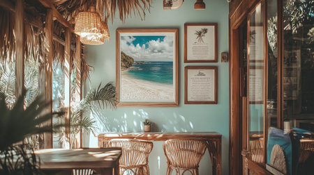 Coastal landscape art gallery wall with elegant framed seascapes and floral arrangement. That the image is generated using AI.