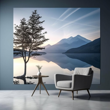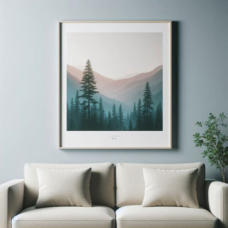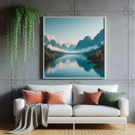 A cozy living room features a plush sofa adorned with soft textiles, complemented by misty lake artwork. This inviting space embraces tranquility and nature.