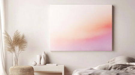 A pristine white canvas adorned with soft watercolor grains in coral and lavender gradients. It adds a tranquil charm to the cozy living space, promoting relaxation and aesthetics.