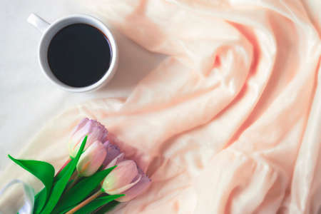 Bouquet of tulips and cup of coffee lies on the background of silk fabric with folds. Morning concept of love, care and tenderness. Concept of a sign of attention for the holiday.