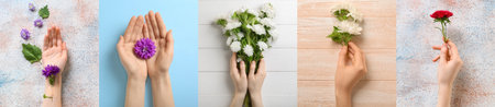 Collage with female hands and beautiful aster flowers