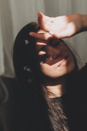 Beautiful sensual woman with lilac petals on face and hair posing in sunlight. Femininity. Moody portrait of young brunette with flowers on face in light and shadow. Skin care and self care
