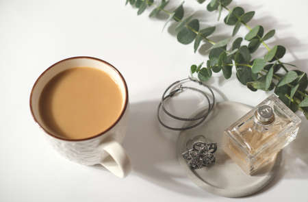 a cup of flat white coffee and female accessories on a white table. perfume bottle and earrings and ring next to green leaves. luxury morning lifestyle
