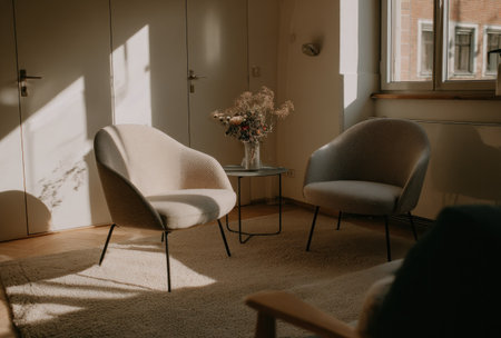 Two curved chairs face each other in a sunlit room, flower bouquet on table