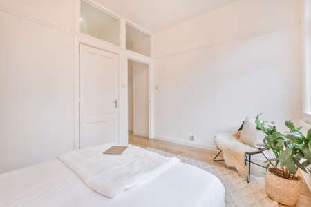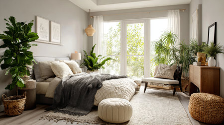 This cozy bedroom interior captures the elegance of natural light filtering through large windows, highlighting lush green plants and stylish decor.
