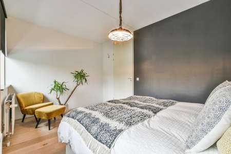 Home interior design of bedroom with bed and wooden wardrobe placed in corner near window in modern apartment