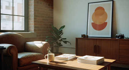 A bright and airy living room featuring a framed artwork, wooden cabinet, and lush plants, bathed in natural sunlight.