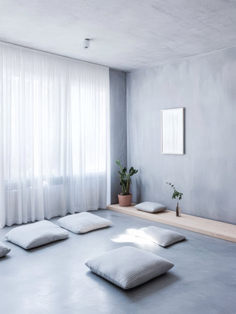 Soft cushions are arranged on a smooth floor in a peaceful room. Natural light filters through sheer curtains highlighting a small plant and an elegant mirror on the wall.