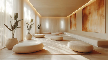 A tranquil relaxation space featuring soft cushions, natural light, and minimalistic decor in a serene setting during daylight hours. Generative AI