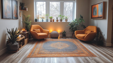Cozy modern living room with orange chairs, plants, and a rug, bathed in soft light on a calm afternoon. Generative AI