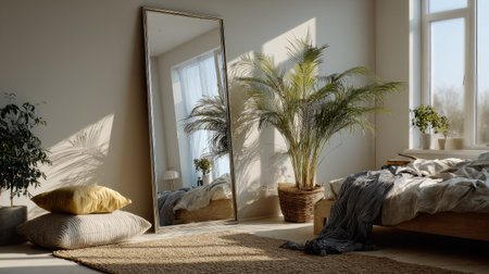 Bright and inviting bedroom featuring a large mirror, lush plants, cozy bedding, and warm sunlight that creates a peaceful and serene atmosphere.