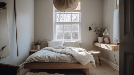 Bedroom decor, home interior design . Scandinavian Rustic style with Window decorated with Wood and Sheepskin material . Generative AI AIG26.
