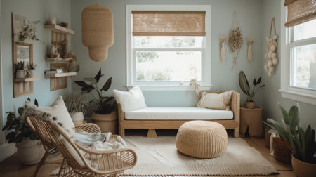 Living room decor, home interior design . Coastal Bohemian style with Bay Window decorated with Rattan and Linen material . Generative AI AIG26.