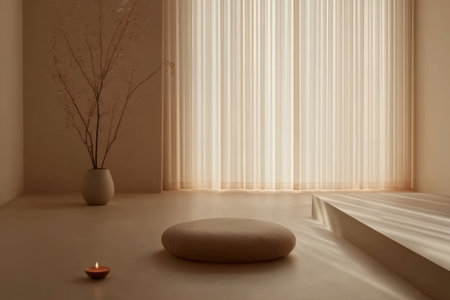 Warm sunlight illuminating minimalist meditation room with round cushion, lit candle, vase with dry branches and sheer curtains