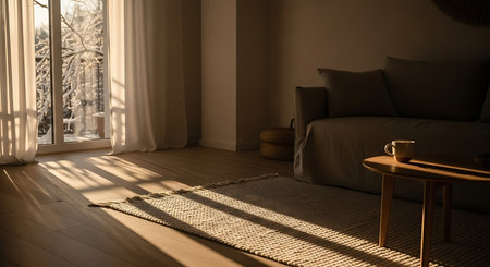 Sunlight streams into a minimalist living room featuring a sofa, coffee table, and plants. The room has a calming, serene atmosphere.