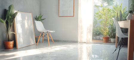 The interior of the room is in the style of minimalism. A room lit by light from a window. AI generated.