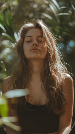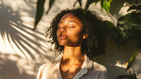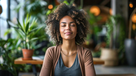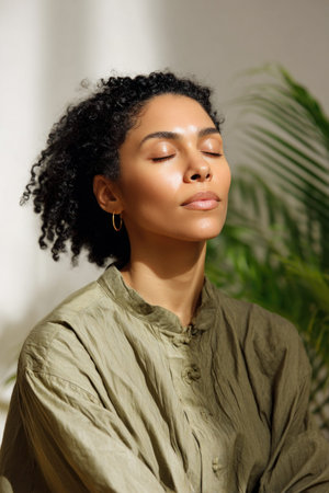 Woman with closed eyes enjoying peaceful meditation indoors, surrounded by natural light and greenery, embodying tranquility and mindfulness