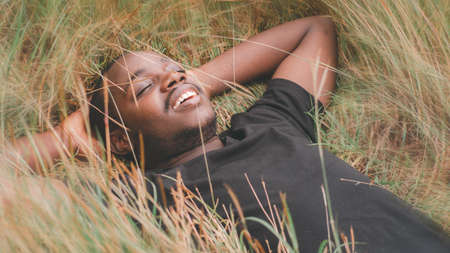 Relax african man lying on the field in beutiful meadow.Happy and enjoy nature concept