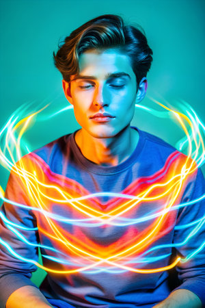 A man sits in a meditative position with glowing blue and orange waves surrounding them