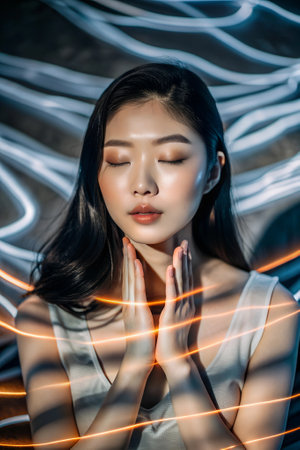 An Asian woman with smooth tan skin and shoulder-length hair enjoys the sea breeze at sunrise. She wears a pastel dress, eyes closed, creating a calm and spiritual atmosphere.
