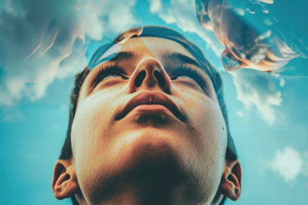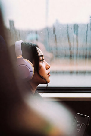 Generative AI : beautiful girl listening to music on headphones in the sky