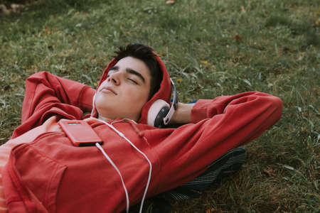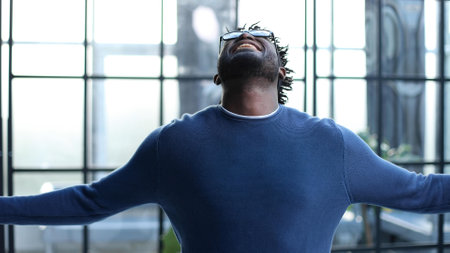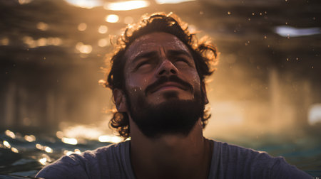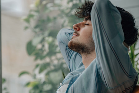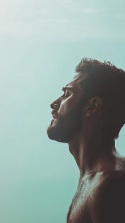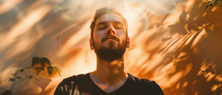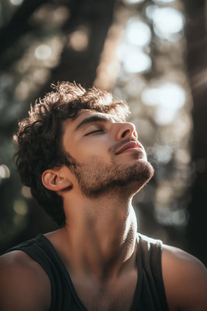 Serene male enjoying fresh air outdoors, basking in sunlight and embracing vitality and tranquility