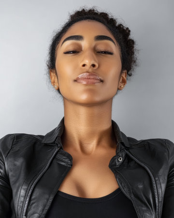 A young woman with curly hair is seen wearing a black leather jacket. She stands confidently with closed eyes, giving an air of relaxation and self-assurance against a plain background.