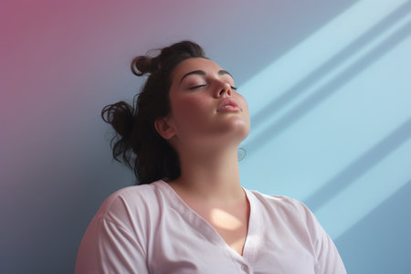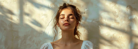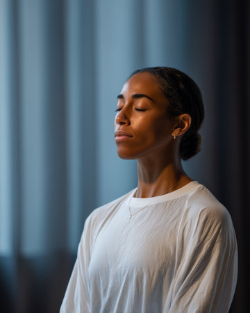 A woman stands with her eyes closed, focusing on her breath. She is indoors, surrounded by soft light during the morning. Her posture shows calm and concentration.