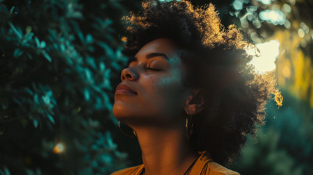 A woman with closed eyes and a peaceful expression is bathed in warm sunset light, creating a serene and reflective moment.