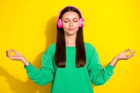 Portrait of lovely adorable person closed eyes hands fingers meditate isolated on yellow color background