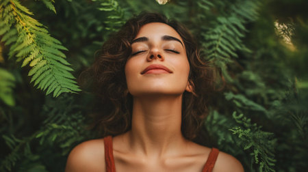 Close-up portrait of beautiful young woman with closed eyes on the background of green leaves