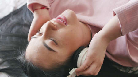 Happy teen girl pink hair wear headphones lying in bed listening music singing.