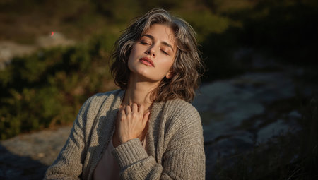 Woman with gray hair sitting outdoors in natural light, eyes closed, wearing a knitted sweater. Captures a moment of calmness, introspection, and emotional depth.