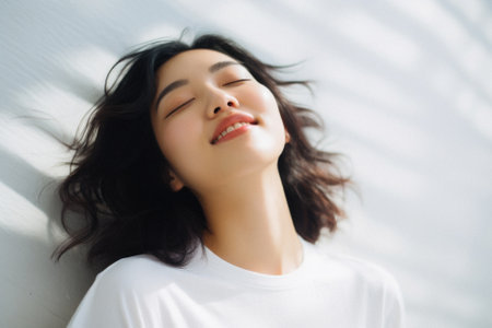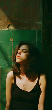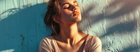 A young woman with her eyes closed basks in warm sunlight while leaning against a textured wall. The serene moment emphasizes relaxation and connection with natural light.