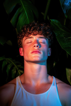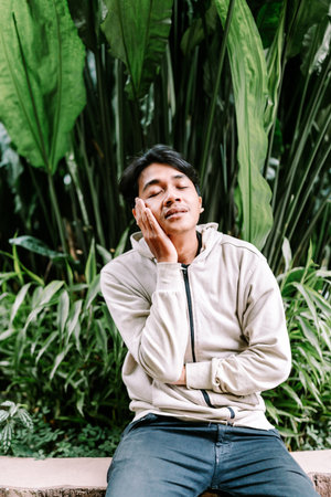A tranquil young man with closed eyes rests his hand on his face, sitting comfortably amidst lush green tropical foliage. He embodies a moment of calm, relaxation, and mindfulness in nature.