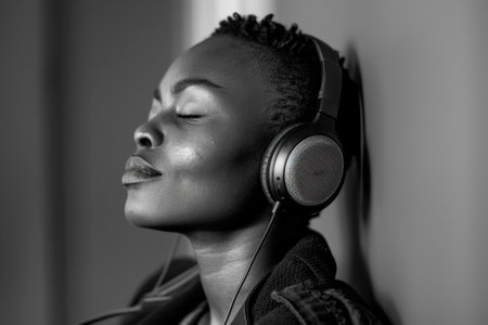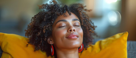 Young woman enjoying relaxation while listening to music on headphones in a cozy indoor setting