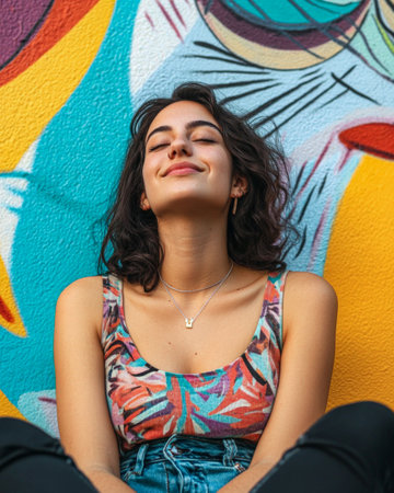 A confident young woman poses against a vibrant, colorful mural featuring abstract shapes and bold lines. She exudes positivity and individuality while enjoying a bright, sunny day outdoors.