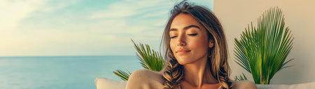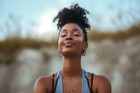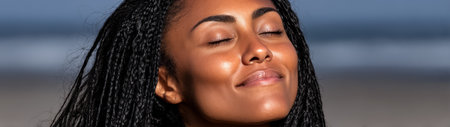 A woman relaxes on the beach closing her eyes and smiling gently as she enjoys the calming sound of ocean waves. The sunlight creates a warm glow on her face enhancing her serene expression.