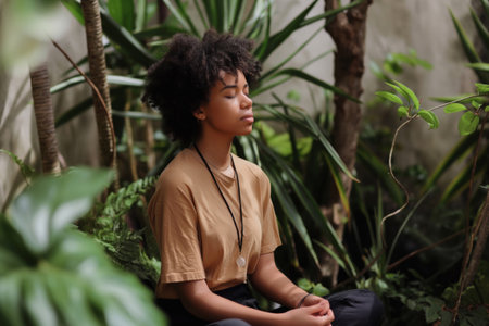 Image of a person in serene meditation among verdant plants, focusing on mental wellness