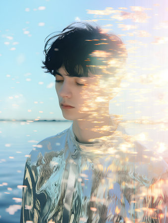 Double exposure portrait of a beautiful woman in silver dress and the sea.