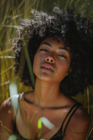 A young woman relaxes in natural sunlight with gentle shadows from lush foliage. The serene ambiance captures beauty, tranquility, and moments of joy.