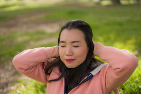 lifestyle portrait of young happy and beautiful Asian Chinese woman in pink sweater lying on green grass cheerful and excited playing outdoors enjoying carefree