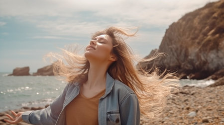 Generative AI: a young, beautiful lady on a rocky beach, her arms wide, enjoying the breeze and taking in the fresh air.