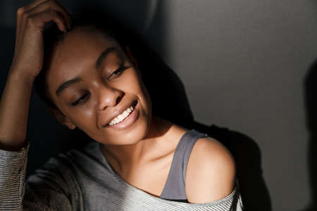 Close-up portrait of young black woman with curly hair posing in studio. Dark-skinned woman wit perfect skin.